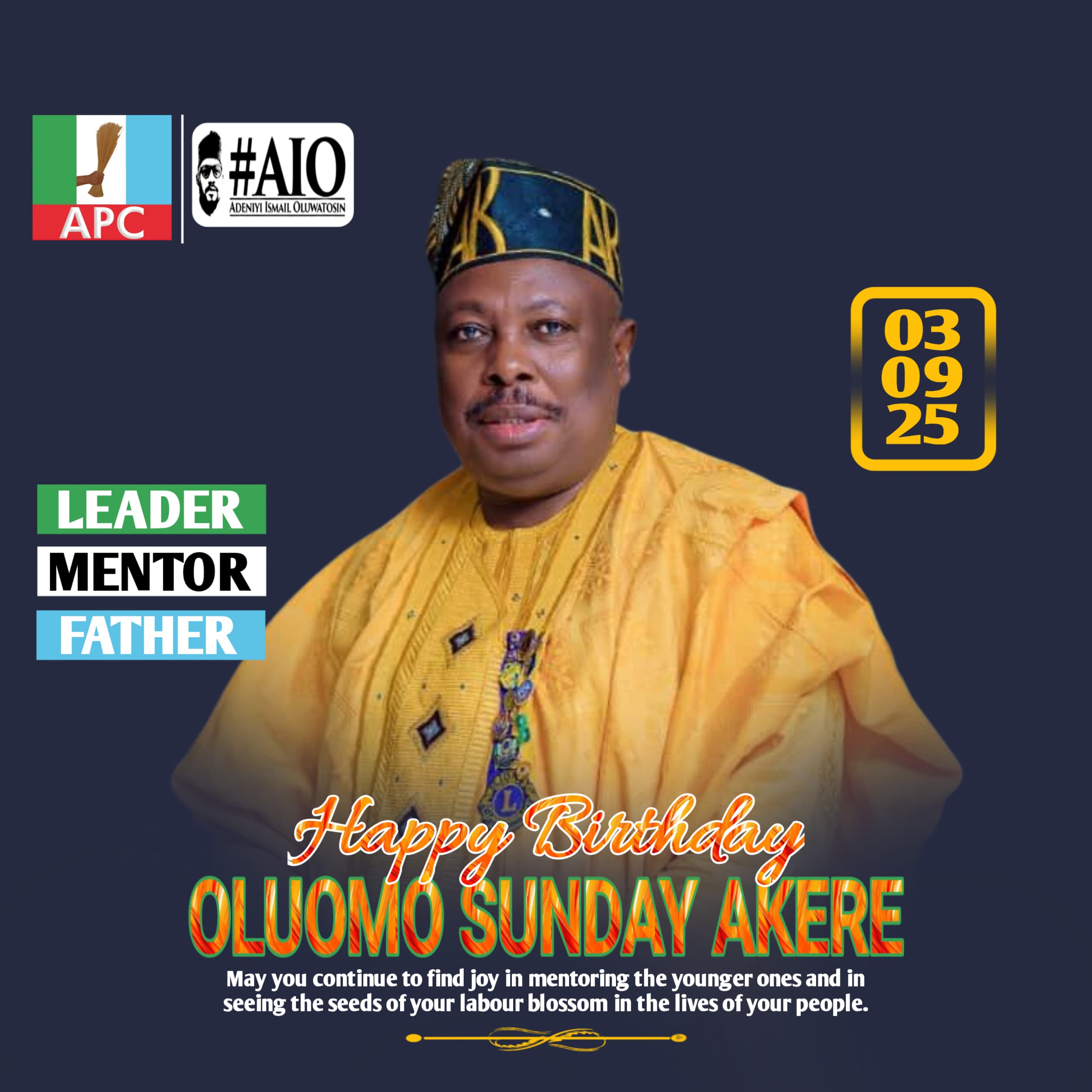 From Hon. Chief Adeniyi Ismail Oluwatosin (AIO), APC Chieftain, Boluwaduro/Ifedayo/Ila Federal Constituency It gives me genuine joy to felicitate with Oluomo Sunday Akere, a respected leader and father figure, on…