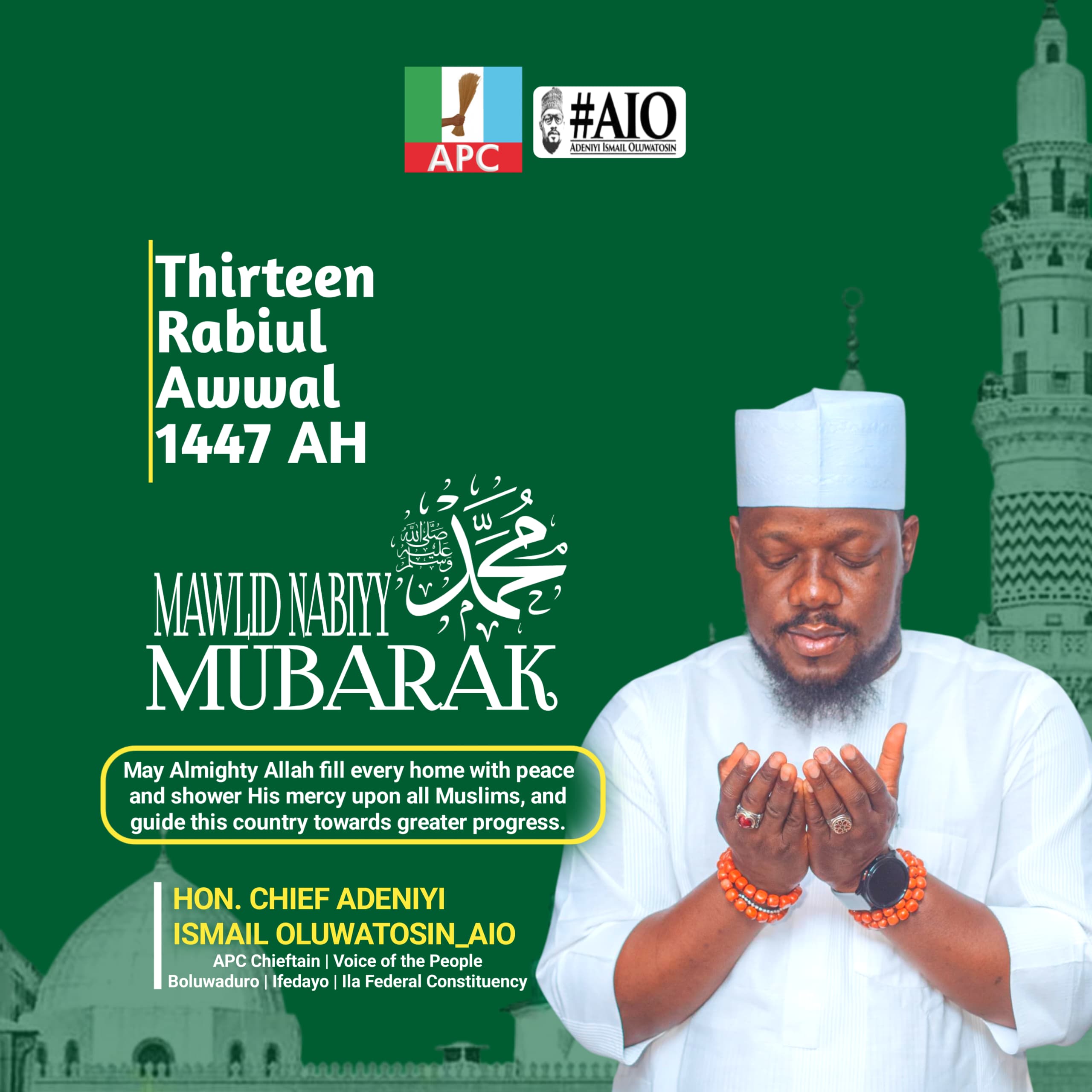 Hon. Chief Adeniyi Ismail Oluwatosin (AIO), APC Chieftain in Boluwaduro, Ifedayo, and Ila Federal Constituency, joins Muslims across the world in celebrating this year’s Mawlid Nabiyy, the commemoration of the…
